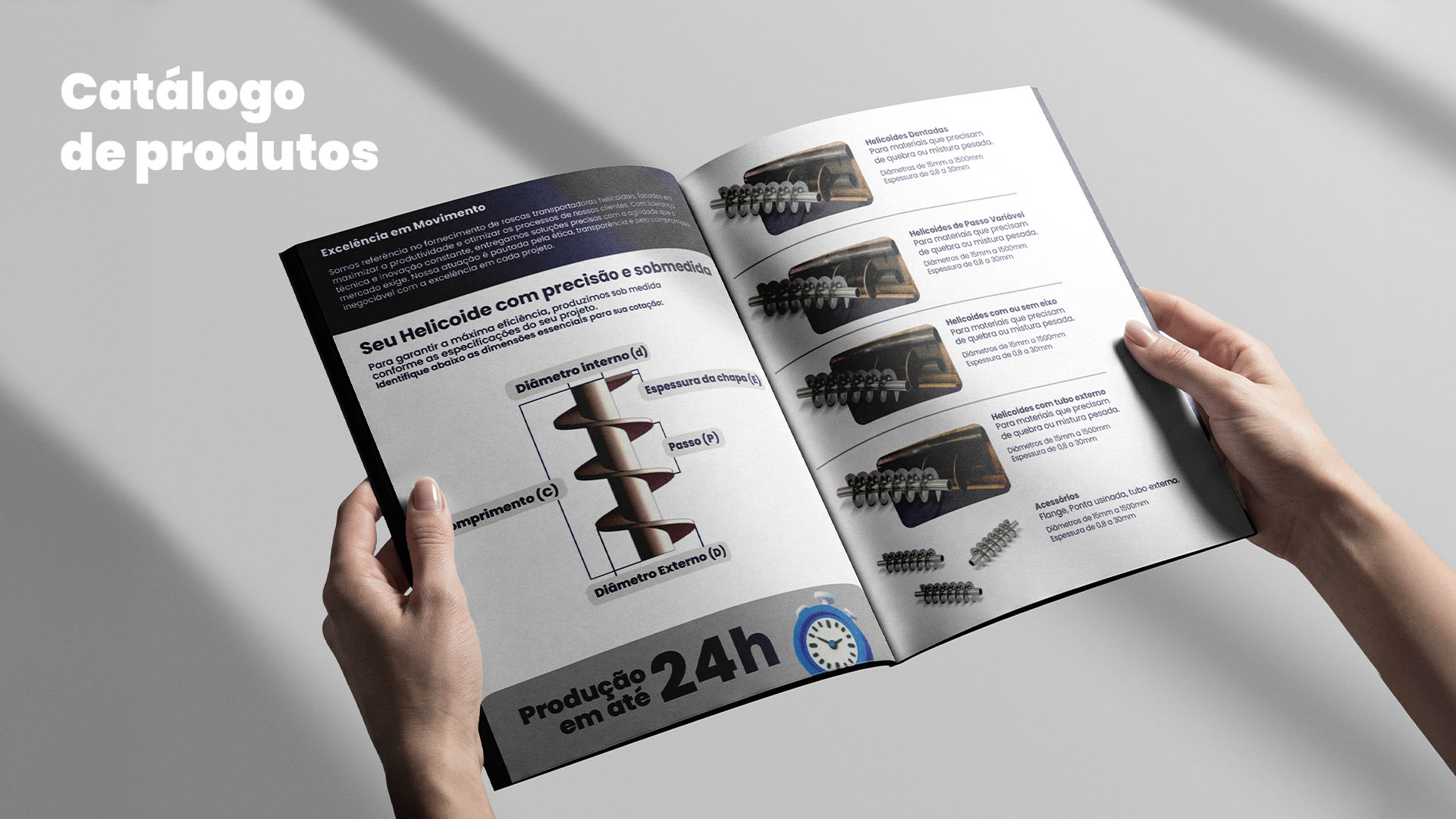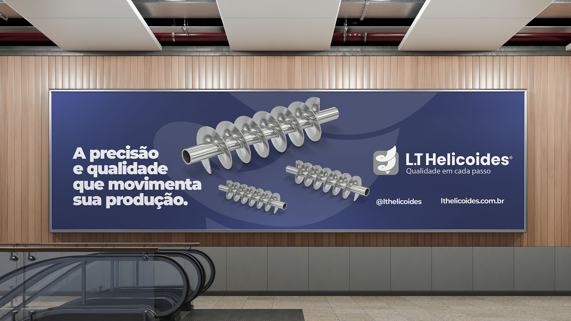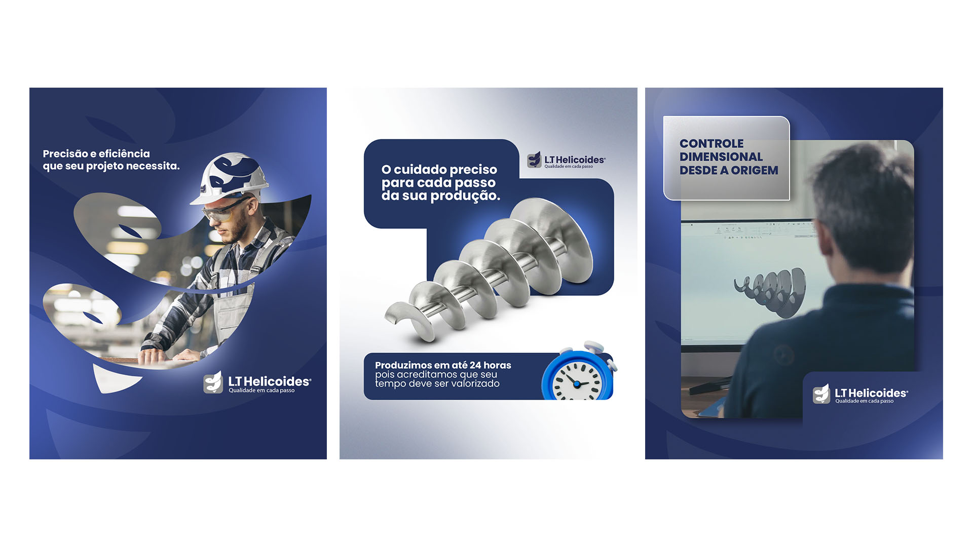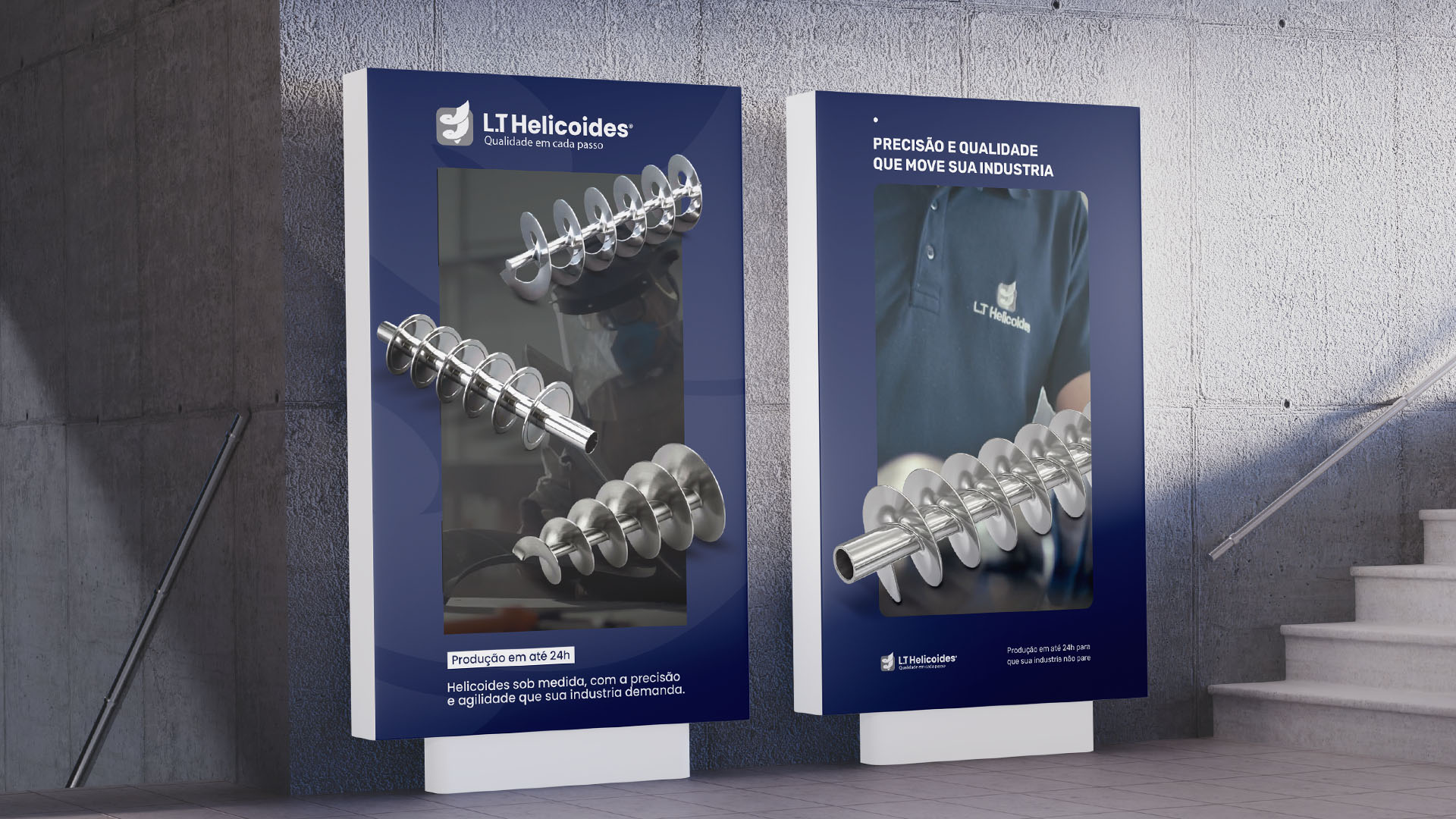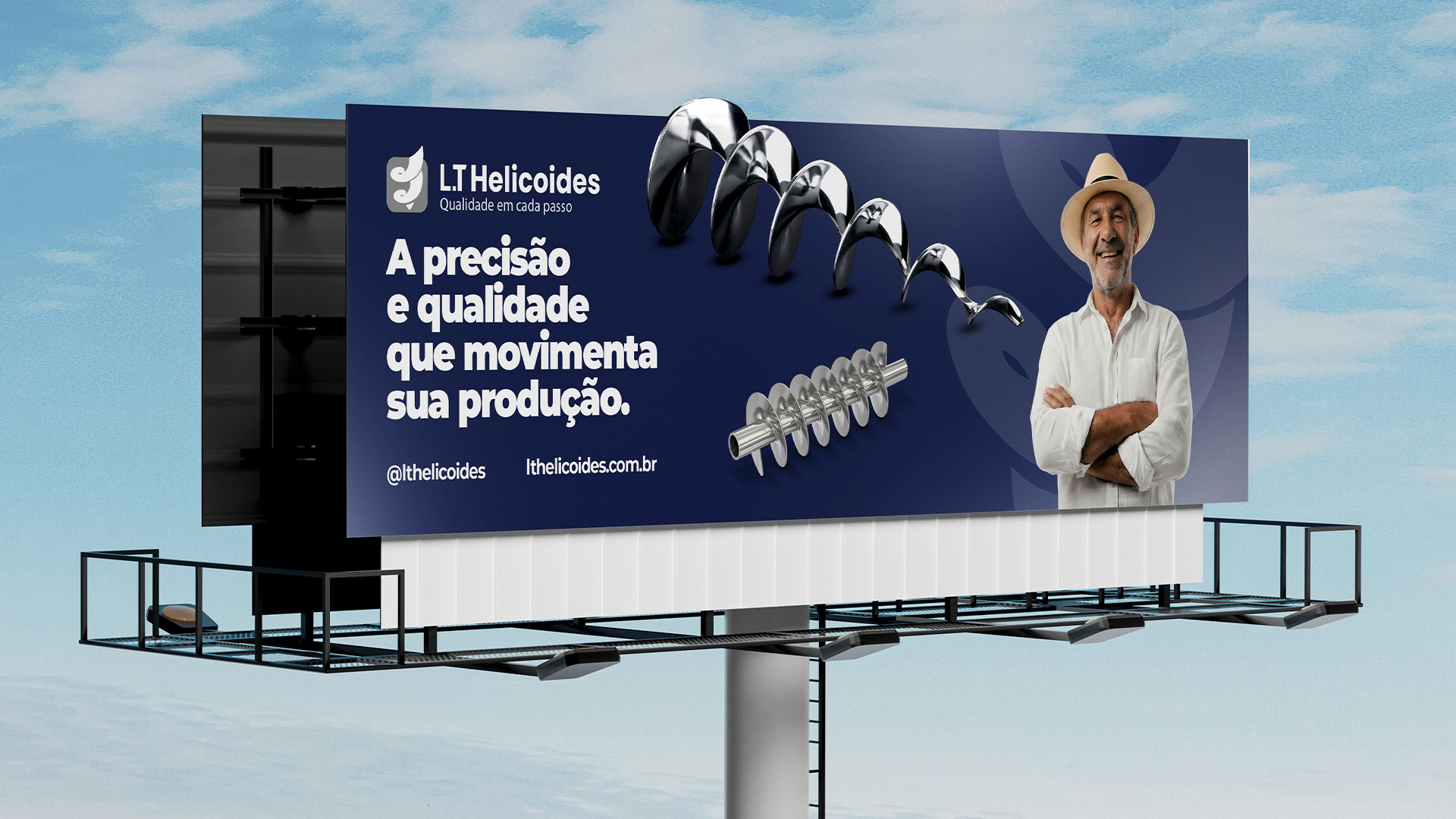 A solução desenvolvida partiu da essência do negócio: os helicoides, especialmente aplicados ao transporte de materiais. A nova identidade foi desenhada para representar com clareza essa especialidade, ao mesmo tempo em que estabelece um tom de comunicação mais sóbrio, técnico e confiável, capaz de conversar diretamente com o produtor rural e seus colaboradores, sem abrir mão da autoridade necessária para evidenciar a qualidade do produto. O resultado é uma marca consistente, de leitura imediata e com força suficiente para diferenciar a L.T Helicoides em seu segmento.