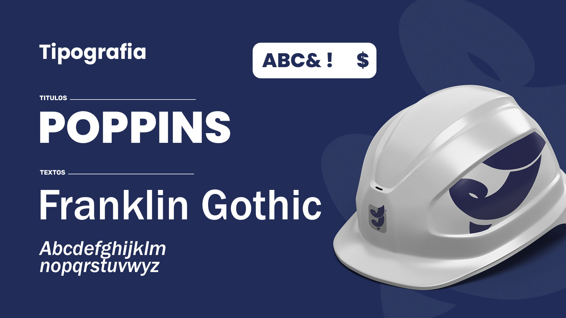 A tipografia foi definida para garantir clareza, equilíbrio e consistência em toda a comunicação da marca. A Poppins, como fonte primária, traz modernidade, excelente legibilidade e presença visual. Já a Franklin Gothic, utilizada como apoio, acrescenta contraste, solidez e reforça o caráter técnico da identidade.